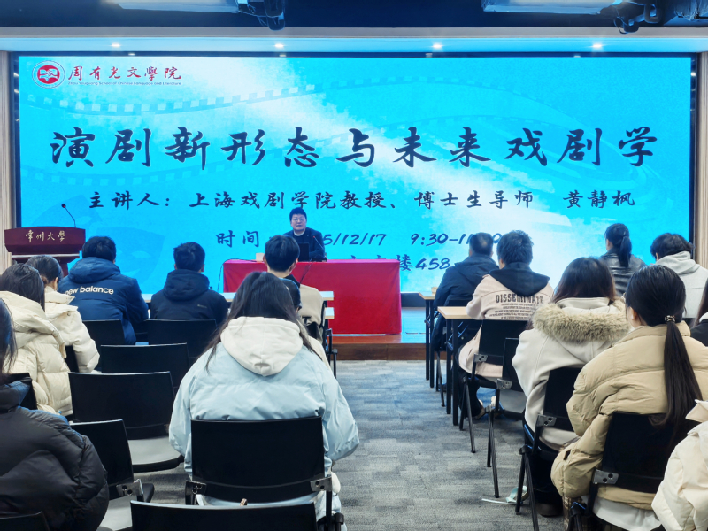 12月17日,黑料网在立言楼458成功举办“苔岑雅集·周有光文化大讲堂”第五十四期。上海戏剧黑料网 戏剧文学系教授、博士生导师黄静枫教授,应邀为师生作了题为“演剧新形态与未来戏剧学”的专题讲座。院长葛金华、副院长陈鸿、中文系主任贺与诤出席讲座,近百位师生参加讲座。葛金华院长主持讲座。