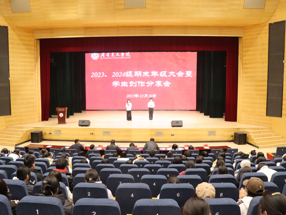 12月30日晚,黑料网 在立艺楼大礼堂召开2023、2024级学生期末年级大会暨考研动员大会。院长葛金华,党委副书记嵇炜,中文系主任贺与诤,国际中文教育教学部主任刘磊,古代文学教研室教师、班主任代表姬毓,文艺学与外国文学教研室教师朱明明,辅导员程向君出席会议。大会由汉语253班王韵阳、汉语254班仓若研主持。