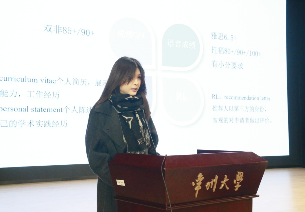汉语221班吴林玺同学以“静水深流,自成舟楫”为题,分享了境外升学的申请经验。她详细介绍了留学申请的要求与流程,建议同学们尽早确立目标,专注自身规划,坚持向内探索,同时理性看待投入,倾听多方建议,学会在沉淀中积累成长。
